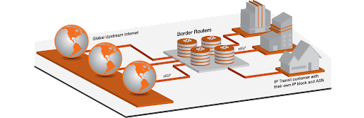 IP Transit៖ គឺ ISP ទៅ ISP ផ្ញើ និងទទួលបុព្វបទនៅទូទាំងអ៊ីនធឺណិតដោយ ASN, BGP និងគោលការណ៍កំណត់ផ្លូវ។ មានន័យថាអតិថិជននឹងផ្សព្វផ្សាយបុព្វបទទៅការទិញតាមចរន្តដោយប្រើលេខ AS របស់អ្នកផ្តល់សេវា។